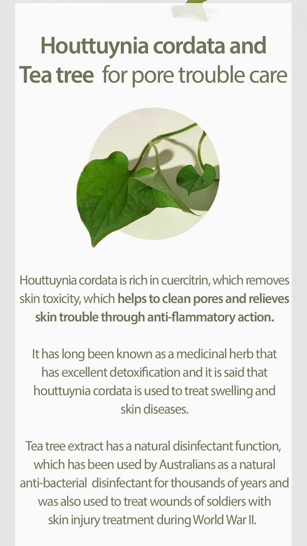 Una crema calmante formulada con extracto de Houttuynia Cordata y extracto de árbol de té, que proporciona un efecto calmante y refrescante instantáneo para la piel irritada por el medio ambiente. Enriquecida con un 71,8 % de extracto de Houttuynia Cordata, con propiedades antiinflamatorias que alivian la piel con problemas y reducen la apariencia de los poros. Contiene un 9,7 % de extracto de árbol de té con potentes propiedades antibióticas para cicatrizar eficazmente las heridas. Contiene pantenol y 6 tipos de ácidos hialurónicos que actúan como humectantes para hidratar la piel desde el interior y prevenir la pérdida natural de agua. Libre de pruebas en animales y sin 16 ingredientes nocivos: parabenos, fragancias y colorantes artificiales, alcohol, aceite mineral, surfactantes y alérgenos.
