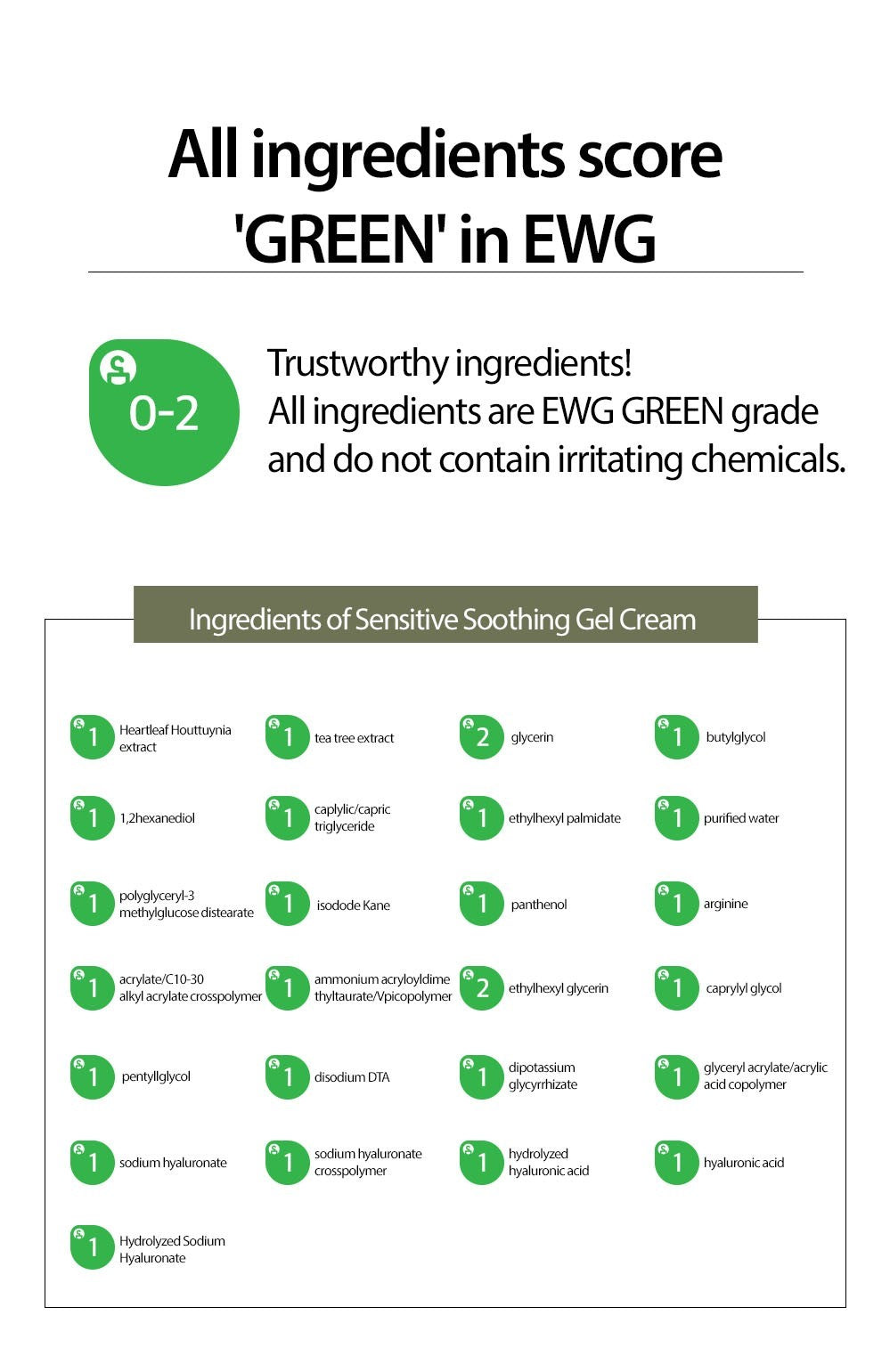 Extracto de Houttuynia Cordata, extracto de Melaleuca Alternifolia (árbol del té), glicerina, butilenglicol, 1,2-hexanodiol, triglicérido caprílico/cáprico, palmitato de etilhexilo, agua, diestearato de poligliceril-3-metilglucosa, isododecano, pantenol, arginina, carbómero, copolímero de acriloildimetiltaurato de amonio/VP, etilhexilglicerina, caprilil glicol, pentilenglicol, EDTA disódico, glicirrizato dipotásico, copolímero de acrilato de glicerilo/ácido acrílico, hialuronato de sodio (2200000 D), polímero cruzado de hialuronato de sodio, ácido hialurónico hidrolizado, ácido hialurónico, hialuronato de sodio (4000 D), hialuronato de sodio hidrolizado.