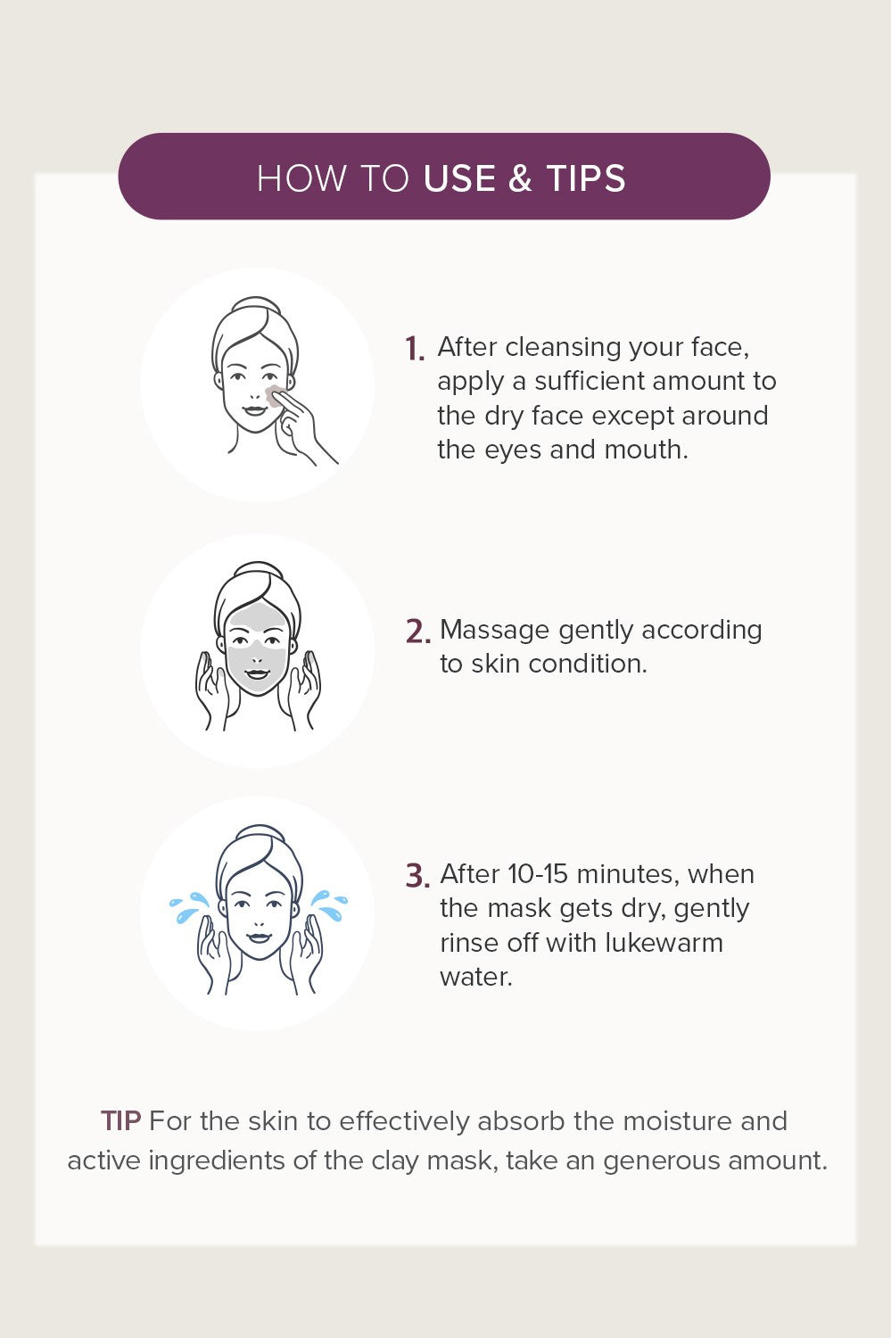 1. After washing your face, gently spread over entire dried face except around the eyes and mouth area. 2. Gently massage according to the condition of the skin. After 10-15 minutes, when the mask has dried up, gently wash it off with lukewarm water. 3. Take a sufficient amount and apply it thickly so that the moisture and active ingredients of the clay mask can be effectively absorbed.