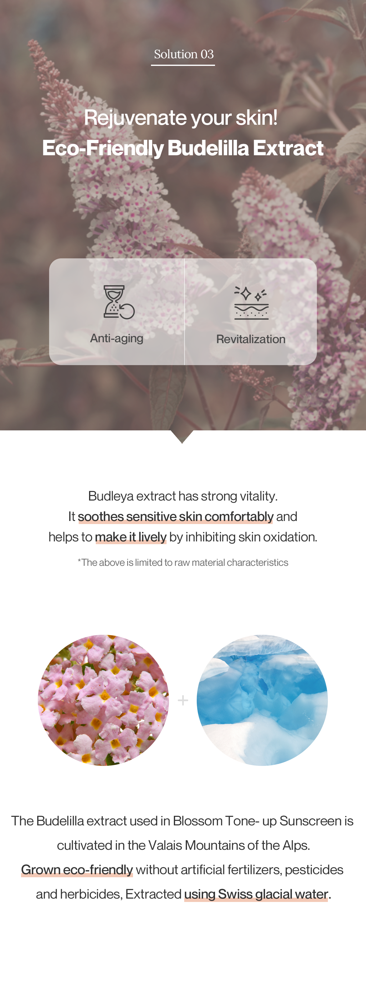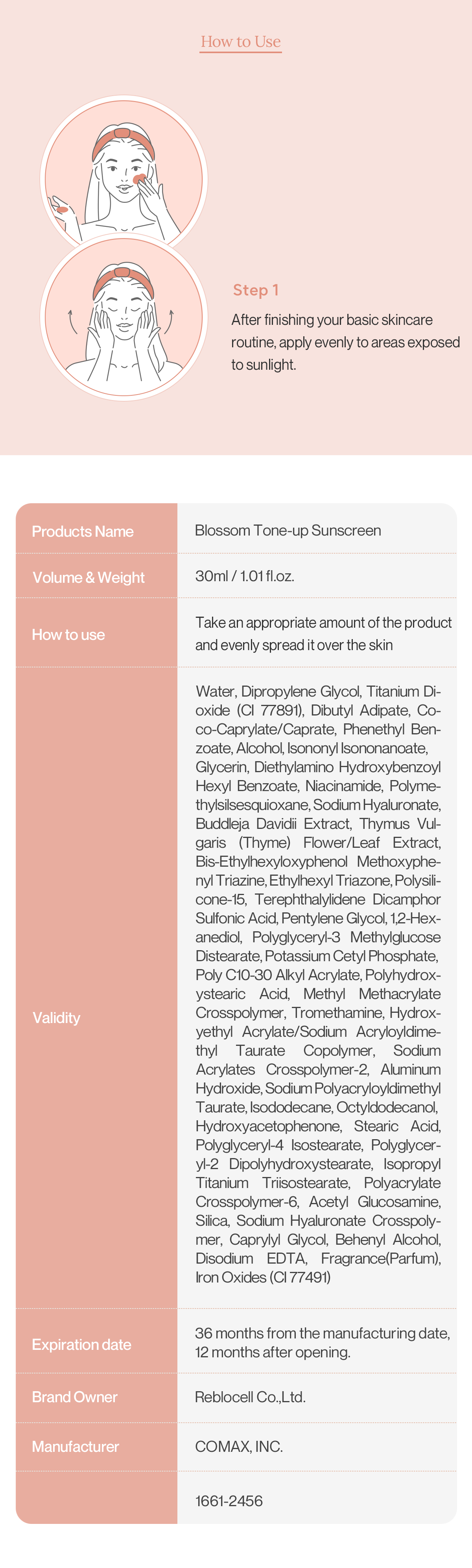 Keep the moisture in and UV out of your skin. • SPF50+ PA++++ Sunscreen with an acacia-derived peptide [sunblock function] • Get refreshed with hydro peptide •Disposable pocket type, easy to take out with A natural and bright tone-up that seems tailored to the skin. A natural pearly tone-up for all skin tones Even for light outings, as a makeup base. A natural and bright pearly tone-up sunscreen A natural and bright tone-up that seems tailored to the skin The satisfaction rate for tone-up is 99.3% Solution 1 smoothly, But finishes refreshingly A smooth aplication with an organic-inorganic hybrid formula Quickly and brightly, on every busy mornings. Just the amount you need, pop it! With an easy-to-use adjustable outlet Quickly and conveniently Even when spread quickly by hand, it is evenly applied without clumping. Skin texture and natural tone correction. it's easy to use as a makeup base Solution 3 Rejuvenate your skin! Eco-Friendly Budelilla Extract Budleya extract has strong vitality. It soothes sensitive skin comfortably and helps to make it lively by inhibiting skin oxidation The Budelilla extract used in Blossom Tone-up Sunscreen is cultivated in the valais mountains of the Alps. Grown eco-friendly without artificial fertilizers, pesticides and herbicides, Extracted using Swiss glacial water. A natural and bright skin solution. Blossom Tone-up Sunscreen - No white cast, a natural tone-up without excess. - A moist and smooth application sensation - A makeup base that provides a refreshing and well-groomed skin. - Budelilla extract using Swiss glacial water Brightening functional cosmetics We have received brightening functionality certification from the Food and Drug Safety Agency. Let's take care of your skin to make it bright and radiant with Blossom Tone-up Sunscreen Sustainable Beauty by Reblocell REEF-SAFE sunscreen We use ingredients that do not harm coral reefs French EVE vegan certification Limit the use of animal ingredients and prohibit animal testing Hypoallergenic test completed Hypeallergenic test completed for safe sue on sensitive skin. Free from harmful ingredients This product is free from 20 types of harmful ingredients, excluding Tu02, according to EWG Green